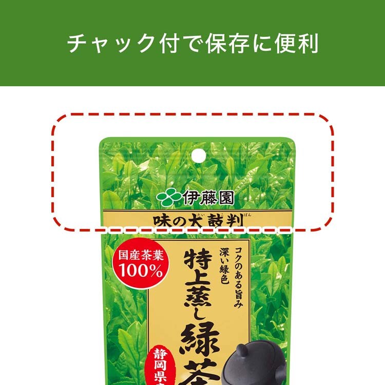 【伊藤園 味の太鼓判 特上蒸し緑茶 静岡県産100%使用 チャック付きスタンド袋の商品詳細】