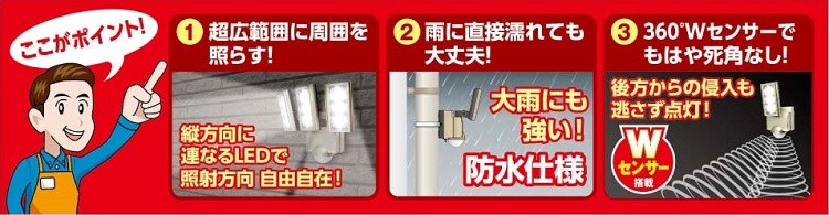 ・本品は人を検地しライトを点灯させる機能を持っていますが、侵入・盗難を確実に阻止する商品ではありません。発生した被害、損害につきましては責任を負いかねますのであらかじめご了承ください。