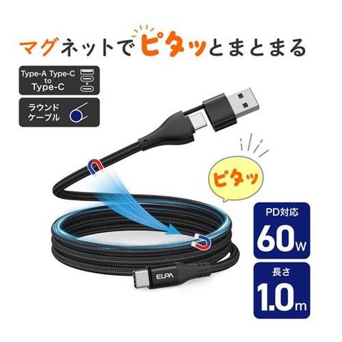 ELPA(エルパ) マグネットUSBケーブル A&CtoC PD60W 1m MCA-ACC1060 BK (1個)