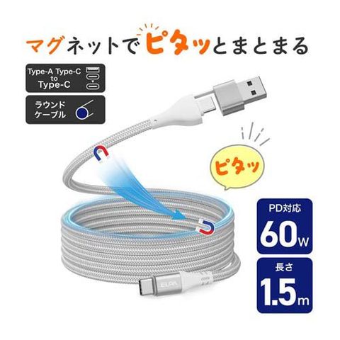 ELPA(エルパ) マグネットUSBケーブル A&CtoC PD60W 1.5m MCA-ACC1560 WH (1個)