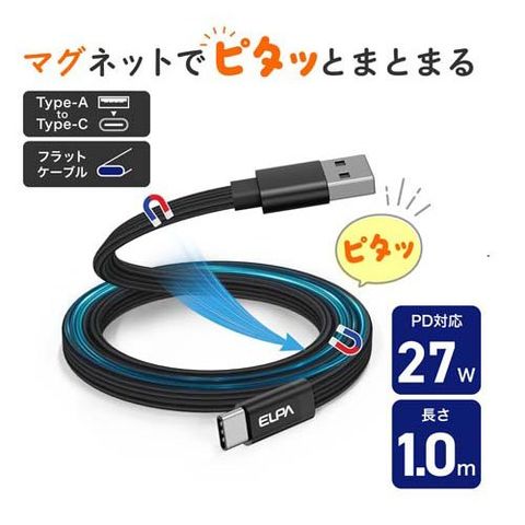 ELPA(エルパ) マグネットUSBケーブル AtoC PD27W 1m MCA-FAC1027 BK (1個)