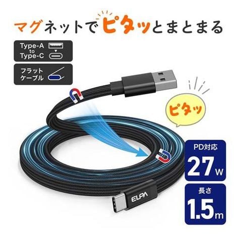 ELPA(エルパ) マグネットUSBケーブル AtoC PD27W 1.5m MCA-FAC1527 BK (1個)