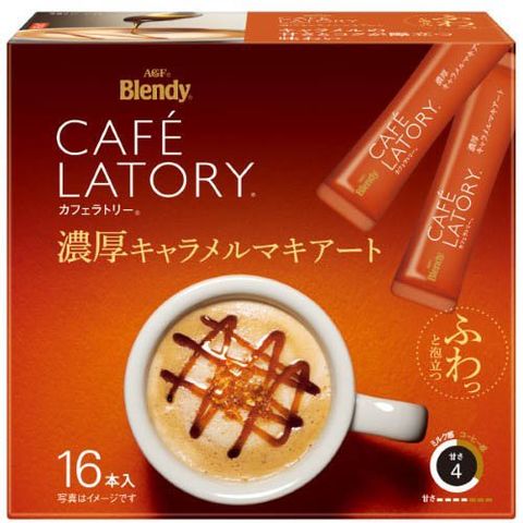 ●AGF(エージーエフ) 「ブレンディカフェラトリー」 スティック 濃厚キャラメルマキアート16本は、甘く香ばしいキャラメルが濃厚ミルクに溶け込んだ、こだわりのキャラメルマキアートの大容量サイズです。