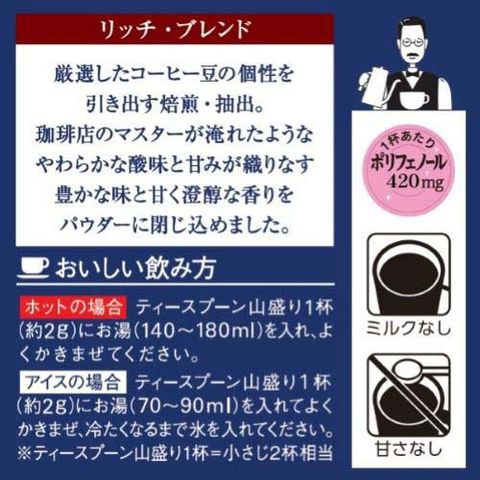 ●珈琲店のマスターが淹れたような香り・味をパウダーに閉じ込めました。あとはお湯を注ぐだけ。香り広がる贅沢なブラックコーヒーを、どうぞ心ゆくまでお愉しみください。