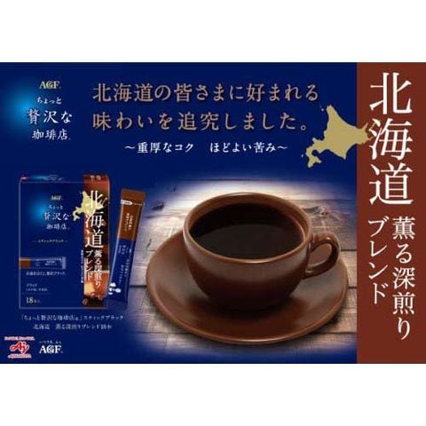 ●AGF(エージーエフ) 「ちょっと贅沢な珈琲店」 スティックブラック 北海道 薫る深煎りブレンド 18本は、北海道エリアで好まれる味わいを追究した、深煎りの薫りと重厚なコクが特長の、こだわりの一杯をお楽しみいただけます。
