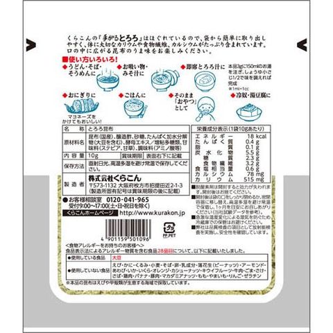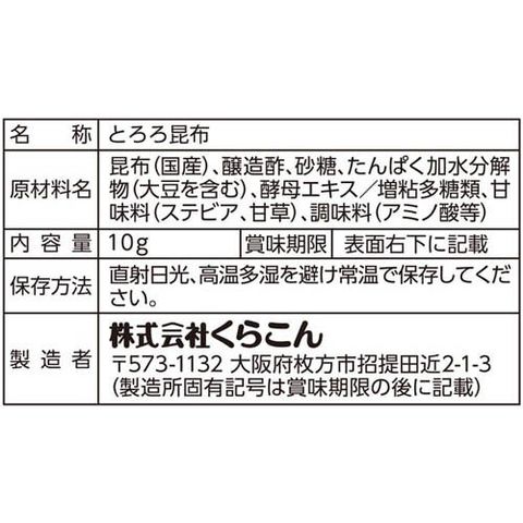 | 昆布(国産)、醸造酢、砂糖、たんぱく加水分解物(大豆を含む)、酵母エキス/増粘多糖類、甘味料(ステビア、甘草)、調味料(アミノ酸等) |