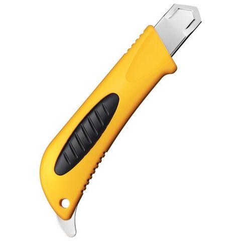 幅広い用途に使用できるネジロック式大型カッターです。刃をしっかり固定できるネジロック式で、開梱・梱包作業やペンキ缶のフタ開けなどに便利な爪が付いています。ラバー製滑り止め付き。