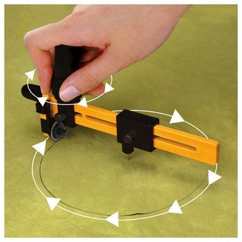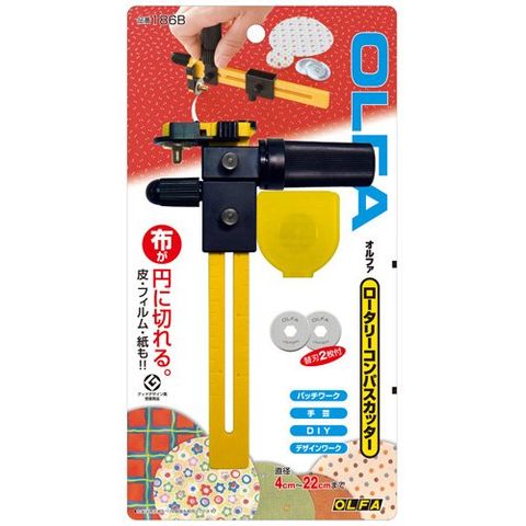 布・紙・フィルムなどを円形に切り抜ける画期的なカッターです。直径4から22cmまでの円の切り抜きが可能で、ハンドルはラチェット機構付きです。刃は直径18mmのステンレス製。針カバー用キャップ付き。