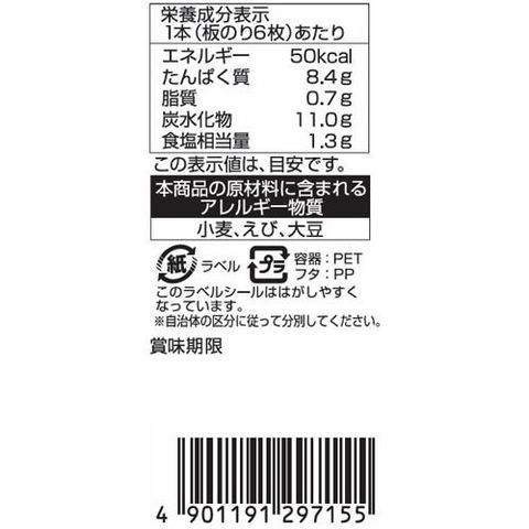 | (1本(板のり6枚)あたり) エネルギー:50kcal たんぱく質:8.4g 脂質:0.7g 炭水化物:11.0g 食塩相当量:1.3g |