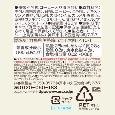 | 牛乳(国内製造)、砂糖、コーヒー、全粉乳、デキストリン/香料、乳化剤、カゼインNa、カラメル色素、安定剤(カラギナン)、セルロース、甘味料(アセスルファムK、スクラロース) |