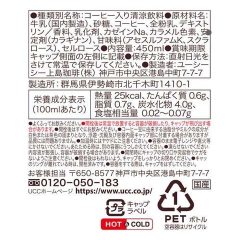 | 牛乳(国内製造)、砂糖、コーヒー、全粉乳、デキストリン/香料、乳化剤、ガゼインNa、カラメル色素、安定剤(カラギナン)、甘味料(アセスルファムK、スクラロース)、セルロース |