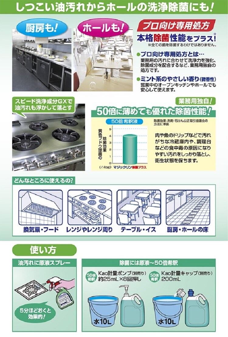 ●厨房のしつこい油汚れにプロ向け専用処方!洗浄と同時に除菌ができる