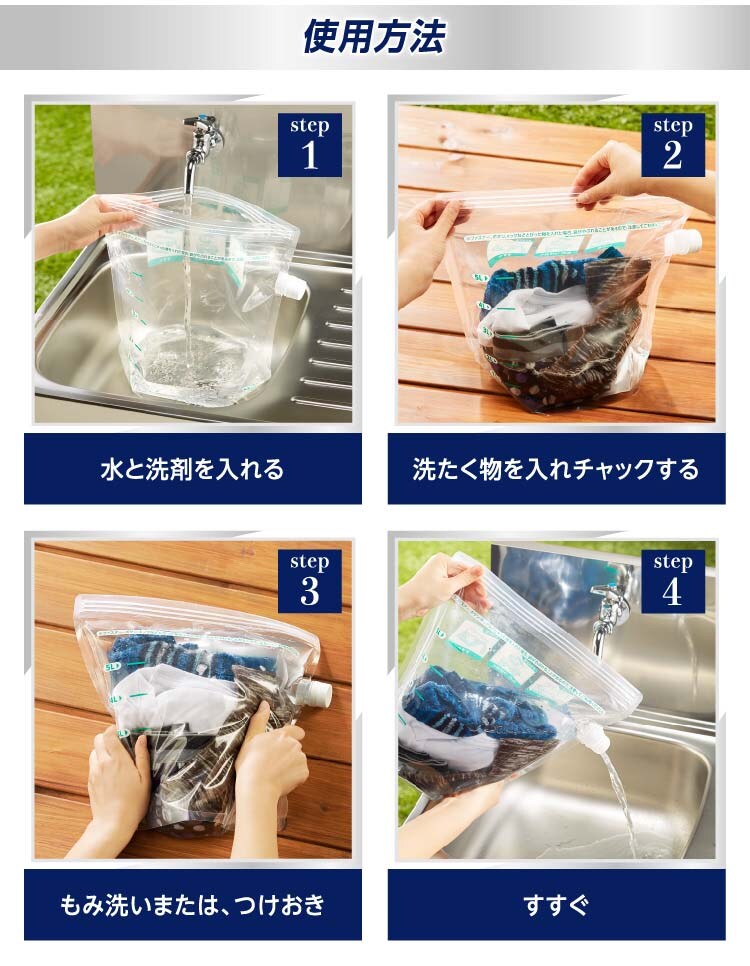 ・もみ洗いする時は、液がもれないようチャックが完全に閉まっていることを確認する。つけおきの場合、目安は30分~1時間。