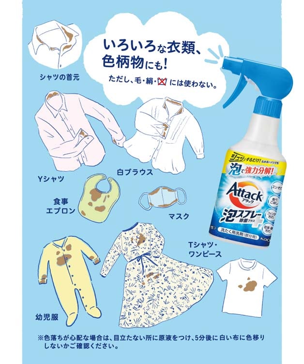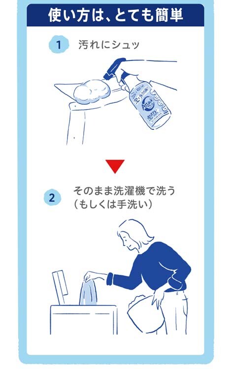 ・汚れに直接スプレーし、他の洗たく物と一緒に洗剤で洗ってください。