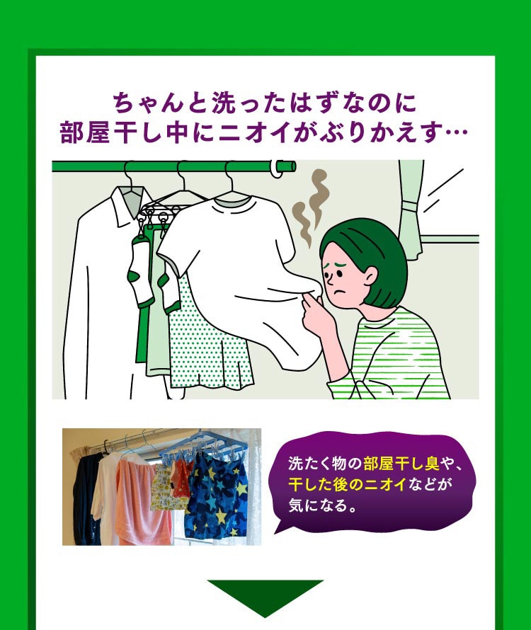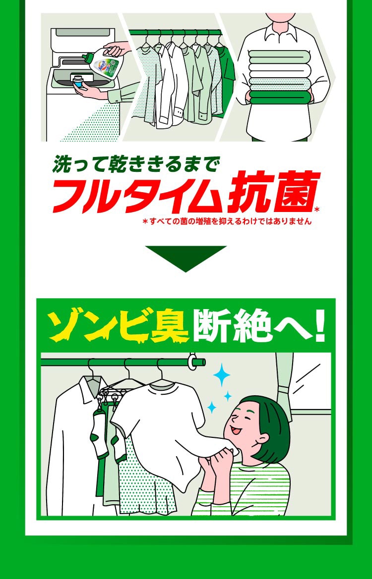 ●「抗ウイルス※2(衣類に付着したウイルスを減らす)」「洗たく槽の防カビ※1」「外干しにも使えます」「すすぎ1回でもOK」「残り湯でもOK」「部屋干し用」