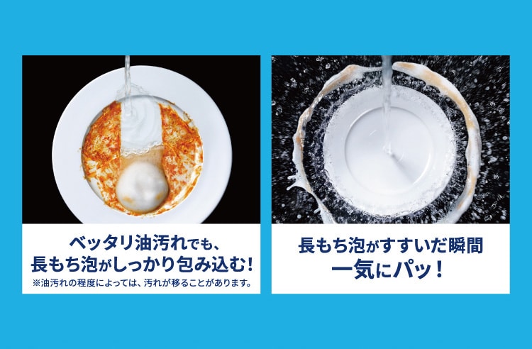 ●キュキュット処方で、ベッタリ油汚れを細かく分解!長もち泡が、すすいだ瞬間一気にパッ!汚れ落ちを指先でキュッと実感。
