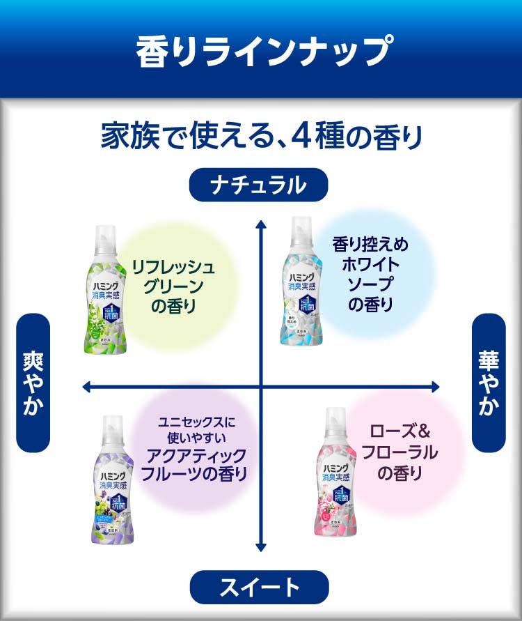 | 界面活性剤(エステル型ジアルキルアンモニウム塩)、安定化剤、香料 |