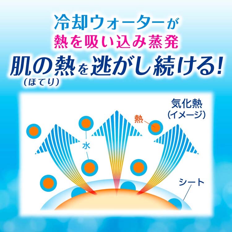 ●厚手のシートに含まれるたっぷりの冷却ウォーターが熱を吸い込み蒸発。気化熱の作用で、肌の熱(ほてり)を逃がし続ける!
