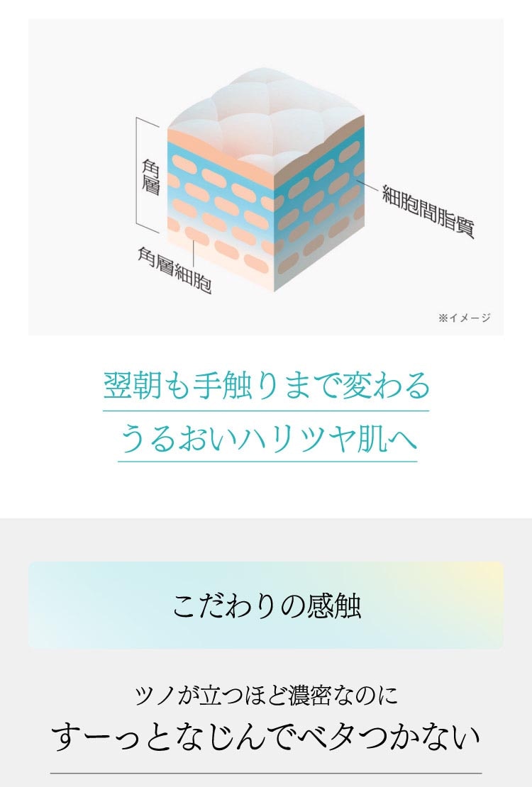 ●角層まで浸透しうるおいで満たし、翌朝も手触りもっちりハリツヤ肌へ。