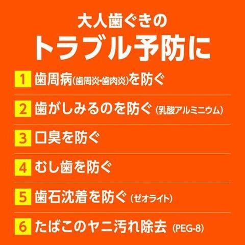 | PEG-8、乳酸アルミニウム、ゼオライト、フッ化ナトリウム(フッ素)、アラントインクロルヒドロキシアルミニウム(ALCA)、塩化セチルピリジニウム(CPC)、β-グリチルレチン酸(BGA) 基剤:炭酸カルシウム、無水硫酸マグネシウム、メチルハイドロジェンポリシロキサン 溶剤:PG 粘度調整剤:無水ケイ酸、ヒドロキシプロピルセルロース 矯味剤:マルチトール、L-アルギニン 安定剤:酸化Ti 発泡剤:ヤシ油脂肪酸アミドプロピルベタイン、ラウロイルメチルタウリンNa 増粘剤:キサンタンガム 香味剤:香料(和漢ゆず&ハーブタイプ) 可溶剤:グリセリン脂肪酸エステル 甘味剤:サッカリンNa、ステビアエキス 清涼剤:l-メントール 着色剤:黄色203号、赤色226号 |