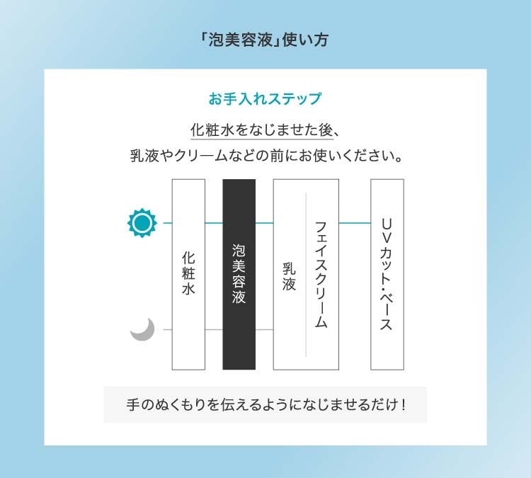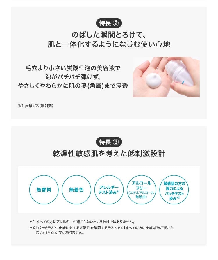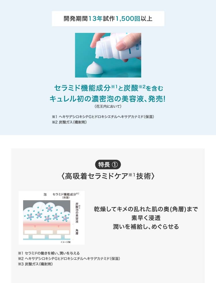 ●セラミド機能成分※2(保湿)と炭酸※3を含む濃密泡の美容液が、肌の角層深くまで素早く浸透・保水します。