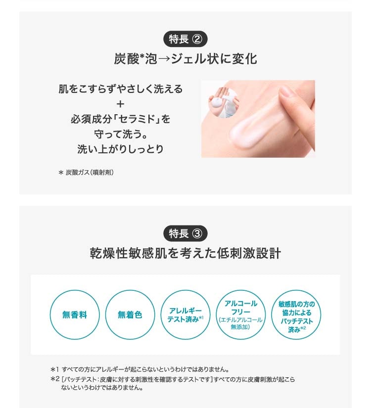 | 成分:グリチルリチン酸ジカリウム※、水、グリセリン、BG、二酸化炭素、POEイソセチルエーテル、ジメチコン、アクリル酸・メタクリル酸アルキル共重合体、水酸化ナトリウム液、 ヒドロキシエチルセルロースヒドロキシプロピルステアリルエーテルヒドロキシプロピルスルホン酸ナトリウム、ヒドロキシプロピルメチルセルロース、エデト酸塩、フェノキシエタノール ※は「有効成分」無表示は「その他の成分」 |