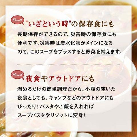 ●トマト、豆、かぼちゃ、きのこのスープの味わいが手軽に楽しめます。