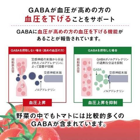 本品にはリコピンとGABAが含まれます。リコピンには血中HDL(善玉)コレステロールを増やす機能が、GABAには血圧が高めの方の血圧を下げる機能があることが報告されています。血中コレステロールが気になる方や血圧が高めの方にお勧めです。