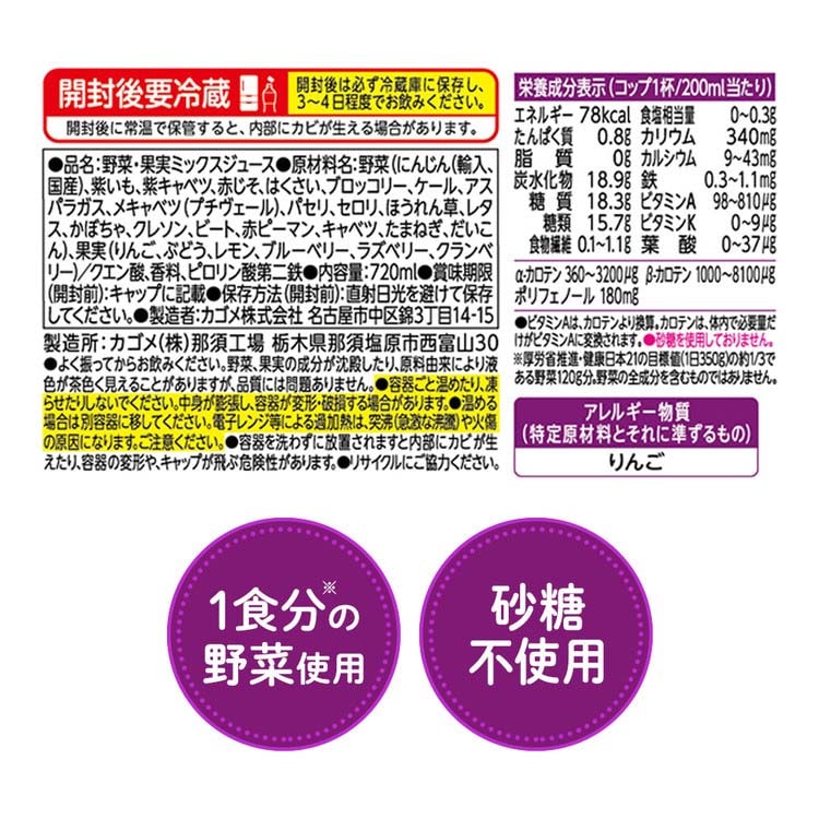 | 野菜(にんじん(輸入、国産)、紫いも、紫キャベツ、赤じそ、はくさい、ブロッコリー、ケール、アスパラガス、メキャベツ(プチヴェール)、パセリ、セロリ、ほうれん草、レタス、かぼちゃ、クレソン、ビート、赤ピーマン、キャベツ、たまねぎ、だいこん)、果実(りんご、ぶどう、レモン、ブルーベリー、ラズベリー、クランベリー)/クエン酸、香料、ピロリン酸第二鉄 |