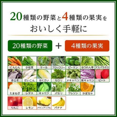 野菜(にんじん(輸入)、小松菜、ケール、ブロッコリー、ピーマン、ほうれん草、アスパラガス、赤じそ、だいこん、はくさい、セロリ、メキャベツ(プチヴェール)、紫キャベツ、ビート、たまねぎ、レタス、キャベツ、パセリ、クレソン、かぼちゃ)、果実(りんご、レモン、パインアップル(沖縄県産100%)、バナナ)/香料、ビタミンC、クエン酸