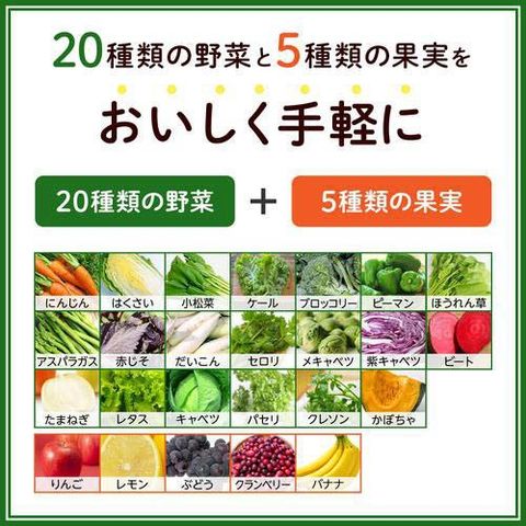 | 野菜(にんじん(輸入)、はくさい、小松菜、ケール、ブロッコリー、ピーマン、ほうれん草、アスパラガス、赤じそ、だいこん、セロリ、メキャベツ(プチヴェール)、紫キャベツ、ビート、たまねぎ、レタス、 キャベツ、パセリ、クレソン、かぼちゃ)、果実(りんご、レモン、ぶどう(長野県産巨峰100%)、クランベリー、バナナ)/香料、クエン酸 |