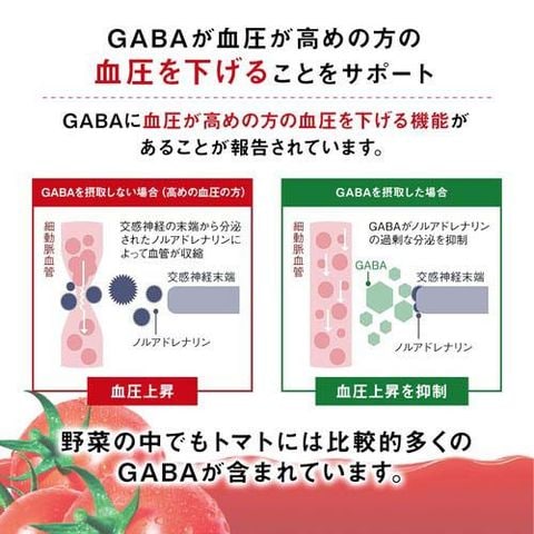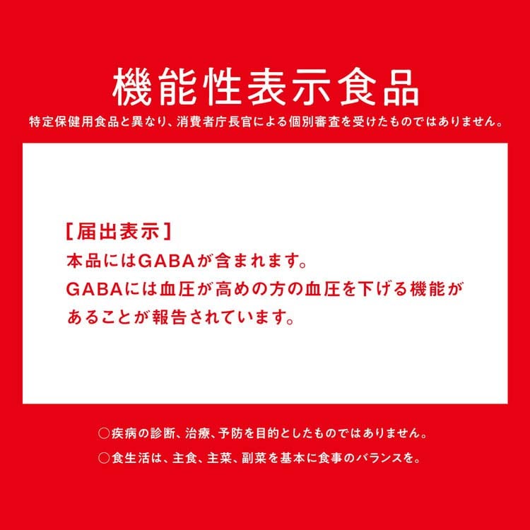 届出表示:本品にはGABAが含まれます。GABAには血圧が高めの方の血圧を下げる機能があることが報告されています。