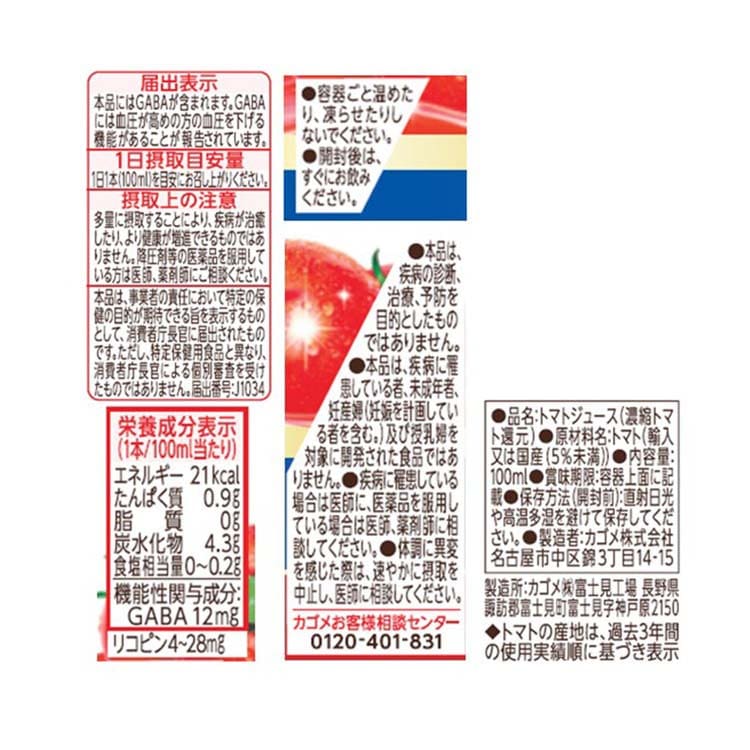 | 1本(100ml)当たり エネルギー:21kcal、たんぱく質:0.9g、脂質:0g、炭水化物:4.3g、食塩相当量:0 -0.2g 機能性関与成分:GABA 12mg リコピン:4 -28mg |