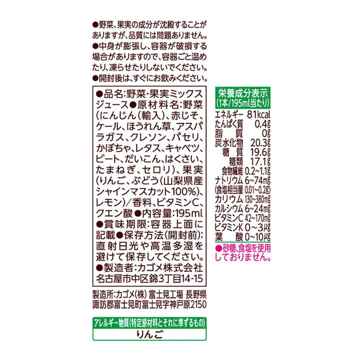 | 1本(195ml)当たり エネルギー:81kcal、たんぱく質:0.4g、脂質:0g、炭水化物:20.3g(糖質:19.6g、糖類:17.1g、食物繊維:0.2 -1.1g)、ナトリウム:6 -74mg(食塩相当量:0.01 -0.2g)、カリウム:130 -380mg、カルシウム:6 -24mg、 ビタミンC:42 -170mg、ビタミンK:0 -3μg、葉酸:0 -10μg |