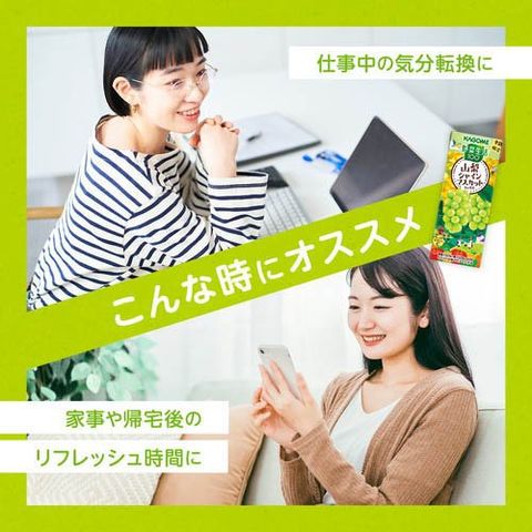●15種の野菜と3種の果実を使用し、山梨県産シャインマスカットのジューシーな味わいに仕上げた野菜&果実100%ジュースです。