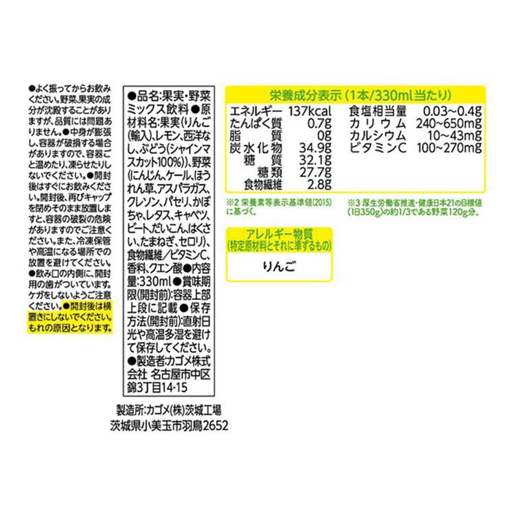 | 1本(330ml)当たり エネルギー:137kcal、たんぱく質:0.7g、脂質:0g、炭水化物:34.9g(糖質:32.1g、糖類:27.7g、食物繊維:2.8g)、食塩相当量:0.03 ~0.4g、カリウム:240 ~650mg、カルシウム:10 ~43mg、ビタミンC:100 ~270mg |