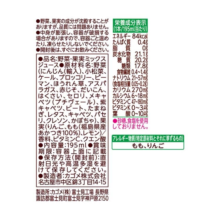 野菜(にんじん(輸入)、小松菜、ケール、ブロッコリー、ピーマン、ほうれん草、アスパラガス、赤じそ、だいこん、はくさい、セロリ、メキャベツ(プチヴェール)、紫キャベツ、ビート、たまねぎ、レタス、キャベツ、パセリ、クレソン、かぼちゃ)、果実(りんご、もも(福島県産あかつき100%)、レモン)/香料、ビタミンC、クエン酸