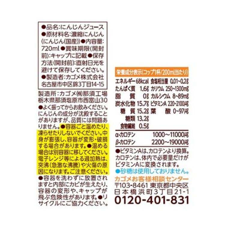 | コップ1杯(200ml)当たり エネルギー:68kcal、たんぱく質:1.6g、脂質:0g、炭水化物:15.7g(糖質:15.2g、糖類:13.2g、食物繊維:0.5g)、食塩相当量:0.01~0.2g、カリウム:250~1300mg、カルシウム:8~89mg、ビタミンA:220~2100μg、葉酸:0~97μg、α-カロテン:1000~11000μg、β-カロテン:2200~19000μg |