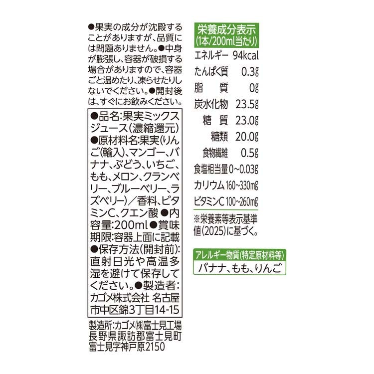 | 1本(200ml)当たり エネルギー:94kcal、たんぱく質:0.3g、脂質:0g、炭水化物:23.5g(糖質:23.0g、糖類:20.0g、食物繊維:0.5g)、食塩相当量:0~0.03g、カリウム:160~330mg、ビタミンC:100~260mg |