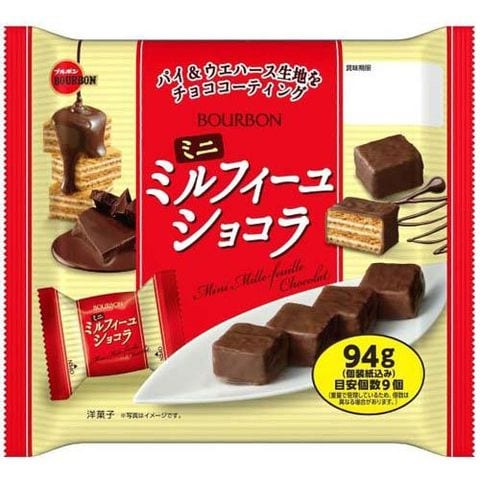 ●バニラクリームをサクサク食感のパイとウエハースではさみ、その上からチョコレートをコーティングした、ひとくちサイズのミルフィーユです。