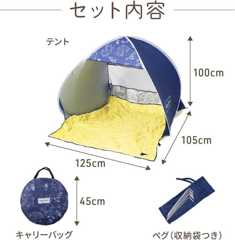 | 各サイズ:テント/幅125×奥行105×高さ100cm(1~2人用)、キャリーバッグ/直径45cm 素材:テント本体・キャリーバッグ/ポリエステル、フレーム/グラスファイバー、フレーム結合部・ペグ/鉄 |