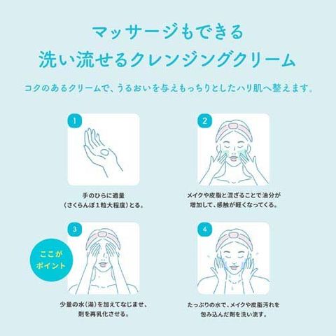 ・適量(さくらんぼ大)を手にとり顔全体になじませ、汚れが浮き上がったら、水またはぬるま湯で洗い流してください。