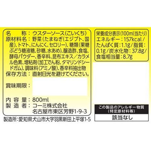 | 野菜(たまねぎ(エジプト、国産)、トマト、にんにく、セロリー)、糖類(果糖ぶどう糖液糖、砂糖、水あめ)、醸造酢、食塩、酵母パウダー、香辛料、昆布エキス/カラメル色素、増粘剤(加工でん粉、タマリンドシードガム)、調味料(アミノ酸)、香辛料抽出物 |