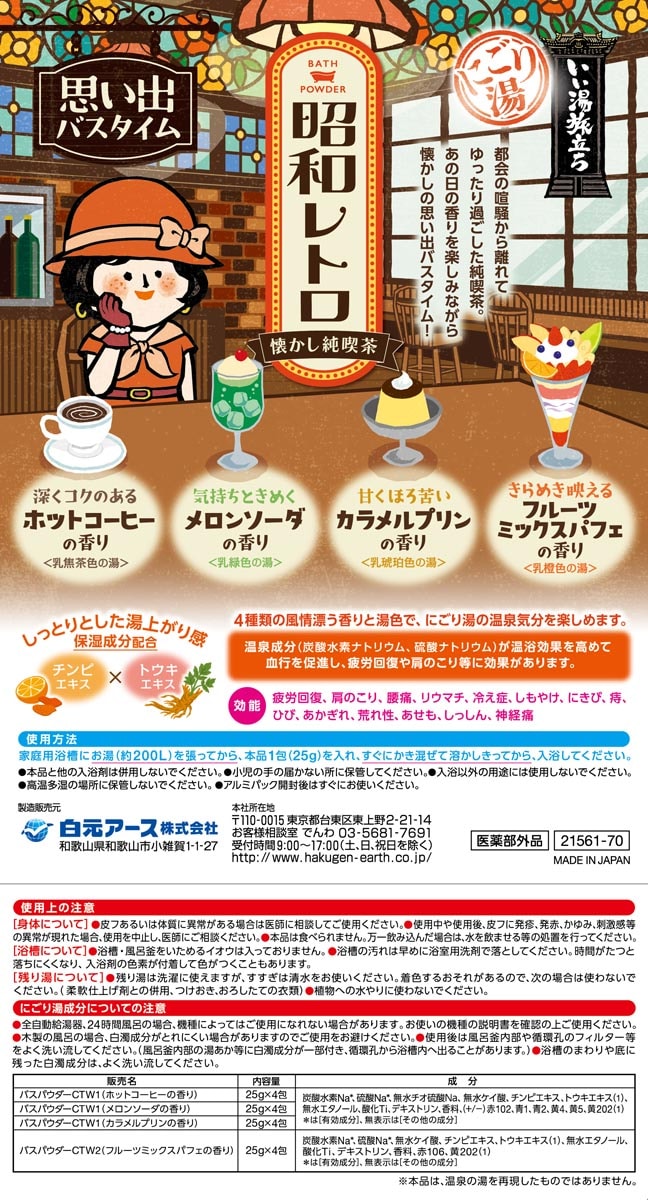 | ★バスパウダーCTW1 炭酸水素Na※、硫酸Na※、無水チオ硫酸Na、無水ケイ酸、チンピエキス、トウキエキス(1)、無水エタノール、酸化Ti、デキストリン、香料、(+/-)赤102、青1、青2、黄4、黄5、黄202(1) ※は(有効成分)、無表示は(その他の成分) ★バスパウダーCTW2 炭酸水素Na※、硫酸Na※、無水ケイ酸、チンピエキス、トウキエキス(1)、無水エタノール、酸化Ti、デキストリン、香料、赤106、黄202(1) ※は(有効成分)、無表示は(その他の成分) |