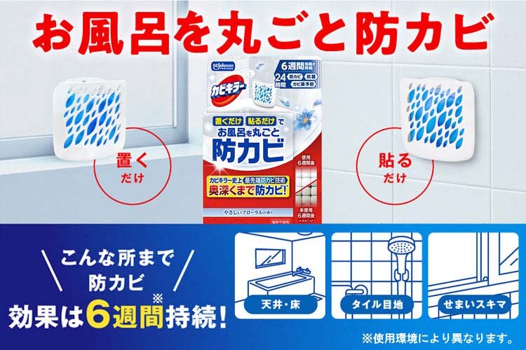 ●持続効果:1個で6週間(※1)、しっかり効果が持続!シャワーや水滴などで防カビ成分が洗い流される心配がありません!