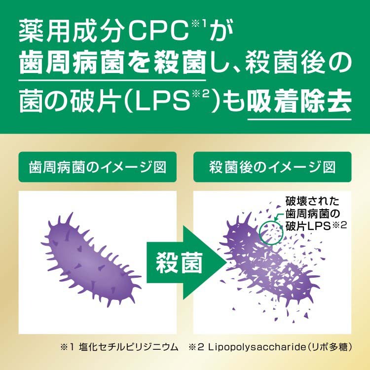 ●殺菌剤CPC(塩化セチルピリジニウム)が歯周病菌を殺菌、殺菌後の歯周病菌の破片も吸着除去。