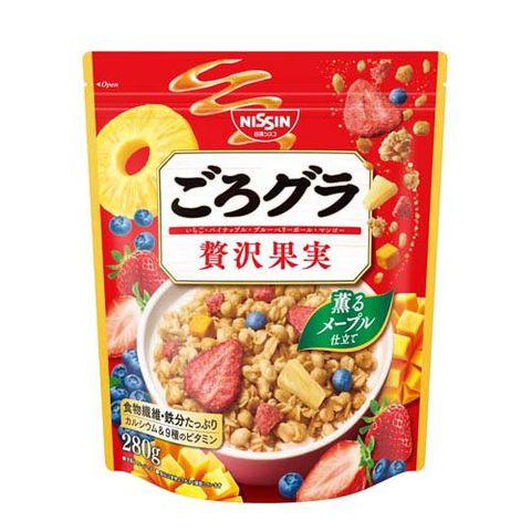 | オーツ麦フレーク(オーストラリア製造又はイギリス製造又はその他)、小麦シリアルパフ(大豆を含む)、ライ麦シリアルパフ(コーングリッツ、ライ麦粉、小麦粉、その他)、砂糖、植物油脂、水溶性食物繊維、乾燥パイナップル加工品、デキストリン、乾燥いちご加工品、乾燥マンゴー加工品、ブルーベリーパフ加工品(砂糖、小麦粉、コーングリッツ、食塩、ブルーベリー果汁パウダー)、乳糖、メープルシロップ/グルコン酸カルシウム、加工でん粉、ビタミンC、乳化剤、着色料(カロチン、クチナシ、アントシアニン)、パプリカ色素、酸味料、香料、酸化防止剤(ビタミンE、ビタミンC、ローズマリー抽出物)、ピロリン酸鉄、増粘剤(アラビアガム)、カゼインNa、光沢剤、ナイアシン、パントテン酸カルシウム、ビタミンB6、ビタミンB1、ビタミンB2、葉酸、ビタミンD、ビタミンB12 |
