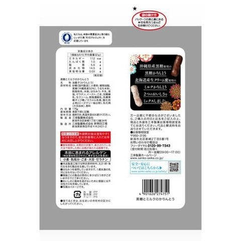 | 砂糖(国内製造)、小麦粉、植物油脂、黒糖(沖縄県産50%)、うるち米粉、脱脂粉乳、水飴、はちみつ、牛乳、食塩、ゼラチン、イースト、ごま、加糖練乳、生クリーム、脱脂濃縮乳、乳糖果糖オリゴ糖/カラメル色素、酸化防止剤(ローズマリー抽出物)、乳化剤(大豆由来)、香料 |
