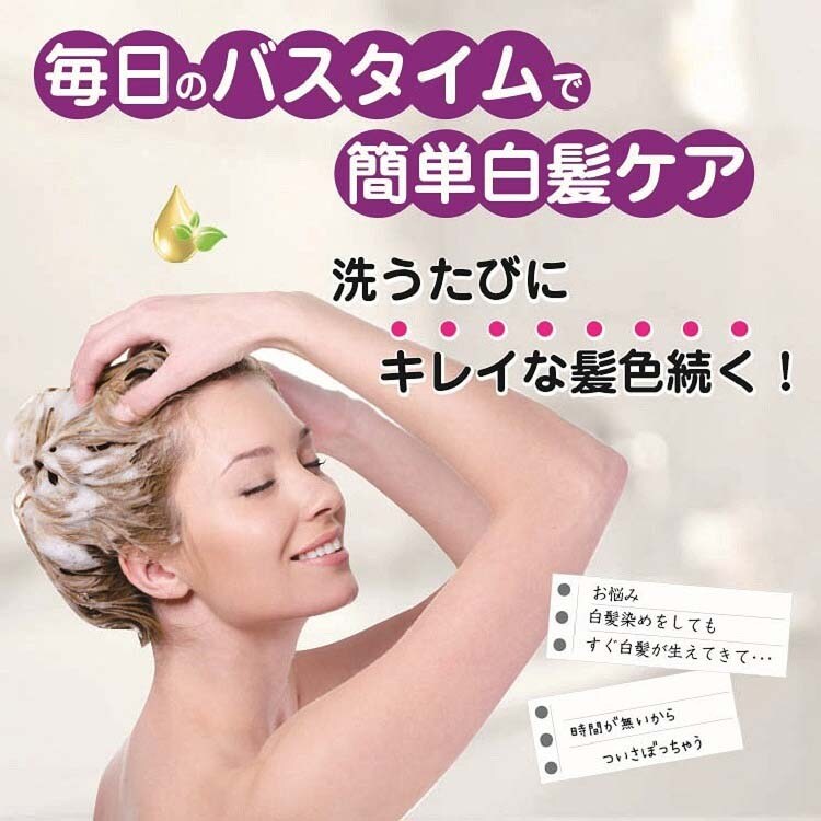 ●お風呂で簡単白髪ケア!洗うたびに白髪に色を与え目立たなくする、着色効果のある白髪染めタイプのノンシリコンシャンプーです。