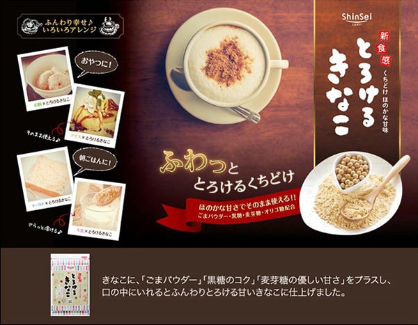 ●きなこに、ごまパウダー、黒糖のコクと麦芽糖の優しい甘さをプラスし、口の中に入れるとふんわりとろける甘いきなこに仕上げました。
